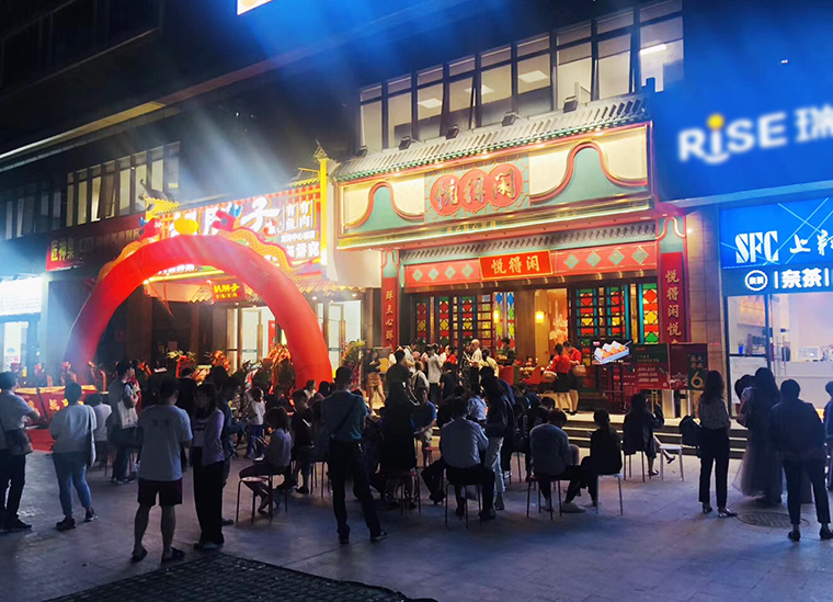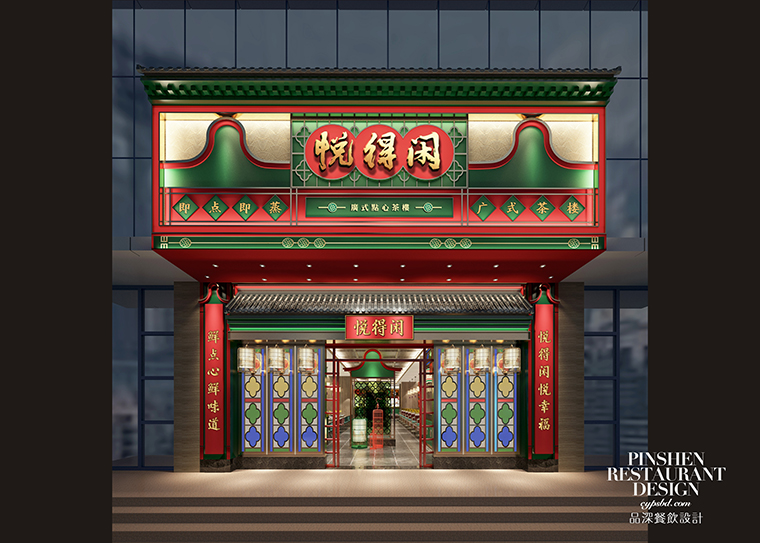 8、門頭形象:門頭是品牌的臉面,也是顧客接觸我們的第一個(gè)場(chǎng)景。門頭形象具有廣而告之的作用,門頭代表著餐廳的名字叫什么,賣的產(chǎn)品是什么,這是最基本且不可或缺的要素。門頭完全可以作為全方位展示店特色的工具,巧妙的組合可用信息向客戶發(fā)送品牌信息,從而引發(fā)客戶興趣。悅得閑廣式點(diǎn)心茶樓的門頭大量使用鑊耳山墻,讓廣式茶樓的特性展露無遺。