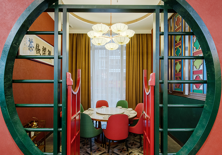 品深餐飲全案設計的悅得閑廣式點心茶樓,家具的軟包顏色使用紅配綠,奢華典雅有活力;大紅配大綠,富貴吉祥更添財氣。家具靠背的圖案則是與品牌文化高度相融的嶺南園林傳統圖形。