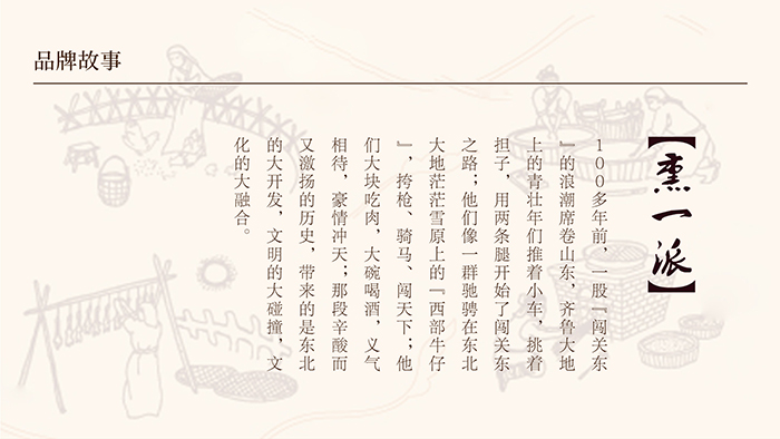 品牌故事將熏一派的由來交代的非常清楚,而且故事發生在闖關東的歷史背景下,富有傳奇色彩。圍繞這品牌故事,我們提取了熏一派的核心訴求:世代傳承,匠心入味。