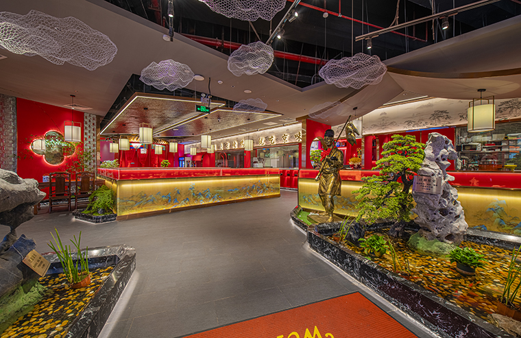 比如品深全案設計深度服務的京味張烤鴨店,在門店中大量使用中國紅強化品牌內蘊的北京故宮皇城文化,令人印象深刻;門口的迎賓人,提籠遛鳥人,跑堂人等雕塑銅人將老北京烤鴨飲食文化自然帶出,別有情趣;空間墻面中使用大幅北京故宮的高精度畫面,配上與烤鴨美食相關的經典詩詞。整個餐廳的