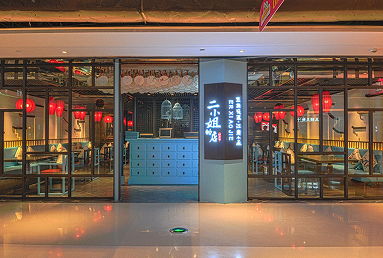 餐廳品牌形象設計,在策劃階段需明確定位,LOGO形象設計清楚表達主題,店面視覺形象上吸睛,有沖擊力。如:二小姐的店,餐廳門前是一組改良設計后的藍綠色多寶格咨詢臺,多寶格根據中式家具的中藥箱款式優(yōu)化設計而來。