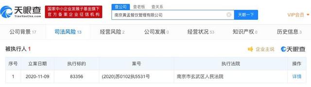 天眼查App顯示,近日,南京黃孟餐飲管理有限公司新增一條被執行人信息,執行法院為南京市玄武區人民法院,案號為(2020)蘇0102執5531號,執行標的83356。據新京報報道,黃磊和孟非共同經營的火鍋店“黃粱一孟”所屬公司即為南京黃孟餐飲管理有限公司。目前,該店已經閉店。此外,今年9月,南京黃孟餐飲管理有限公司發生工商變更,黃磊退出投資人。
