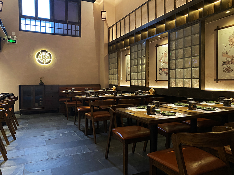 在確定玉椿的品牌主色調上,我們從品牌的文化起源地——京都,查閱了大量燒鳥店、居酒屋的影像資料。發現那些歷經傳承的燒鳥店,居酒屋,都隱藏在京都的小街小巷中,斑駁的大門,青黑色石板路在歲月的沖刷下,有一層溫潤如玉的包漿,厚重素樸,令人悠然而生的一種敬意。以此為淵源出處,我們定出了第一種主色:炭黑色。此色可以傳遞厚重歷史底蘊的品牌特質,同時也是燒鳥用的備長炭所呈現的色,與品牌屬性完整契合。黑色也能很好地傳遞出品牌權威、復古、正宗的日式居酒屋的內在特征。
