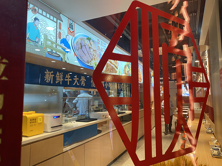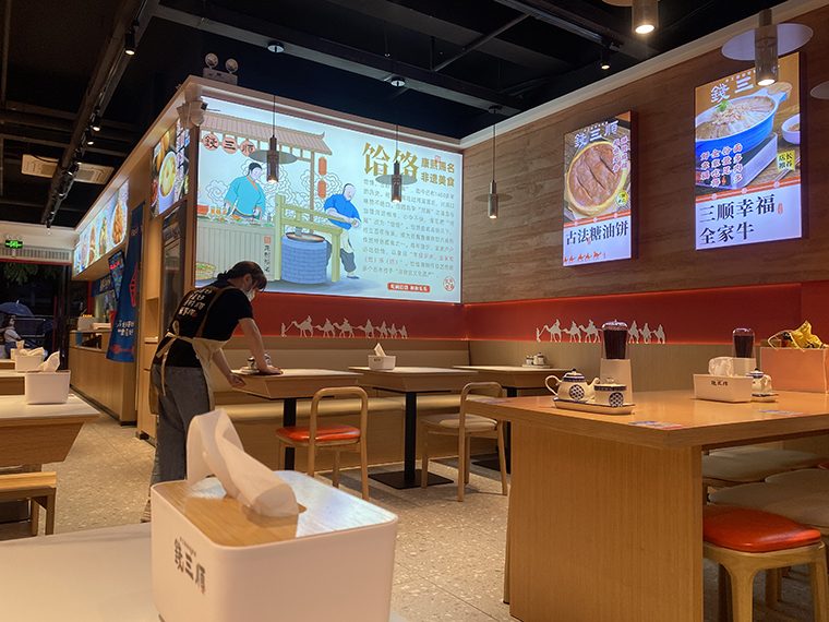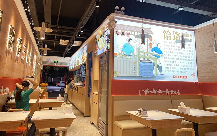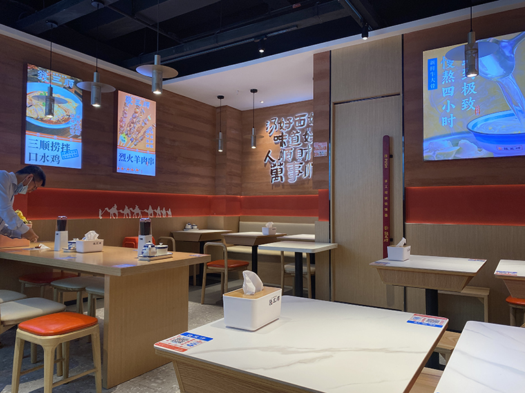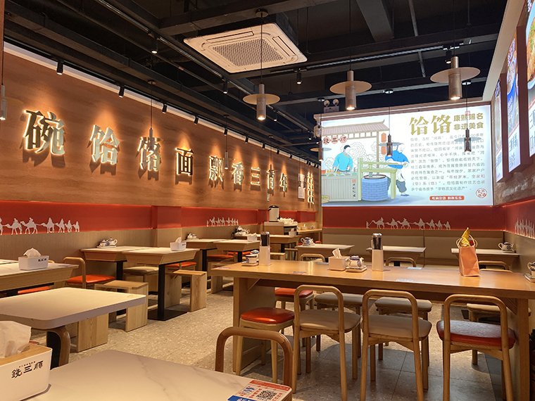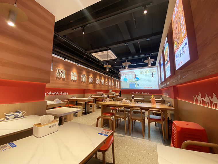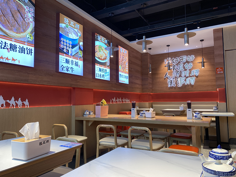 4、品深設(shè)計認為,面館本質(zhì)上與簡餐是一樣的,顧客就是在簡餐和面館之間切換口味而已,所以我們在門店內(nèi)部沒有過多展示品牌的文化。更多是推廣品牌、推廣產(chǎn)品,圖文并茂直接講清楚,饸饹面是一種什么面食?錢三順是怎么來的?錢三順的核心賣點是什么?我們主推哪些產(chǎn)品等等。