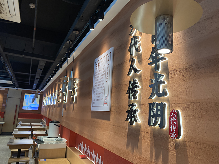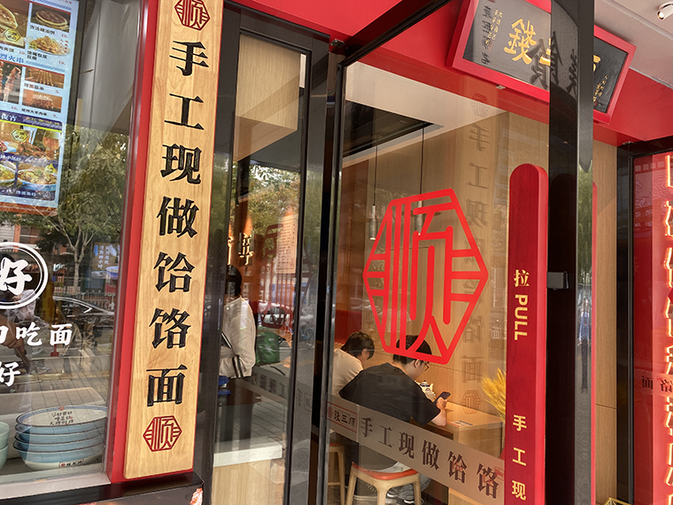 1、從門頭設(shè)計到門面設(shè)計表達,整個門店設(shè)計的重心:手工現(xiàn)做饸饹面,這是我們產(chǎn)品的靈魂,也是我們區(qū)別于其他連鎖面館產(chǎn)品的核心。康熙賜名,是品牌故事的傳說,也是饸饹面權(quán)威背書的一種方式。與門口張貼的非物質(zhì)文化遺傳美食相呼應(yīng),讓消費者對饸饹面有了認知,對錢三順品牌肅然起敬;