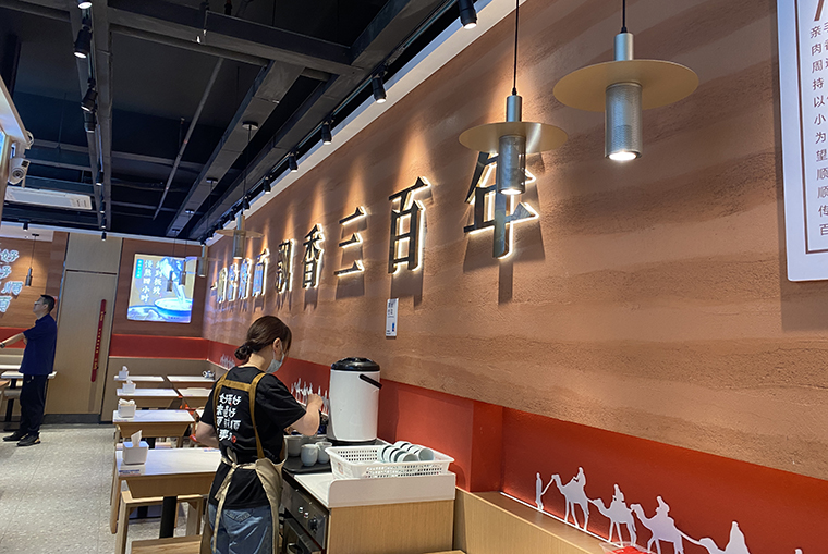 1、整個空間圍繞饸饹面是西北的小吃,在墻面的裝飾材料上用了能代表西北地貌特色的黃土高原涂料,顏色暖黃極像黃土。進入門店,仿佛置身于大西北的某個面館,讓顧客產(chǎn)生了品牌的認同。