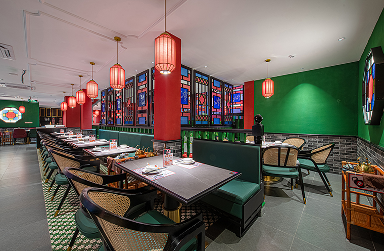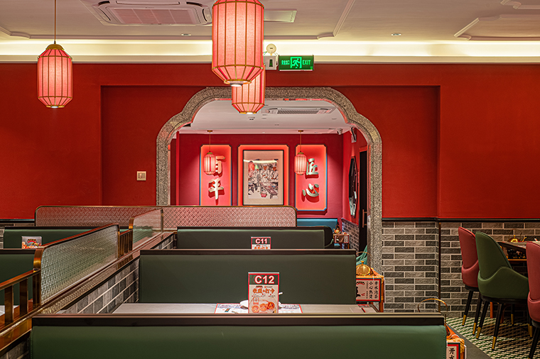 復古紅比鮮紅要暗一些,厚重些,鮮紅是新鮮食材的顏色,表達我們的核心產品賣點,新鮮現做;紅色也是喜慶熱鬧的氛圍表達,可以很好傳達粵點茶樓熱鬧、街坊四鄰飲茶打招呼的場景;